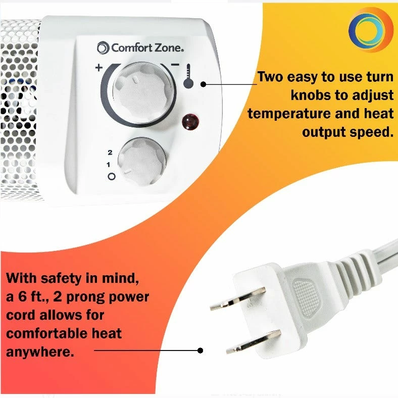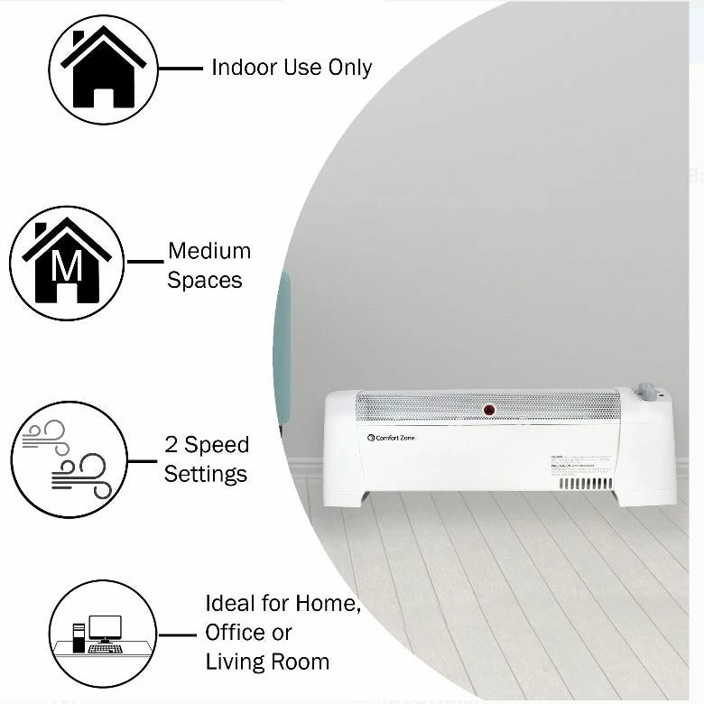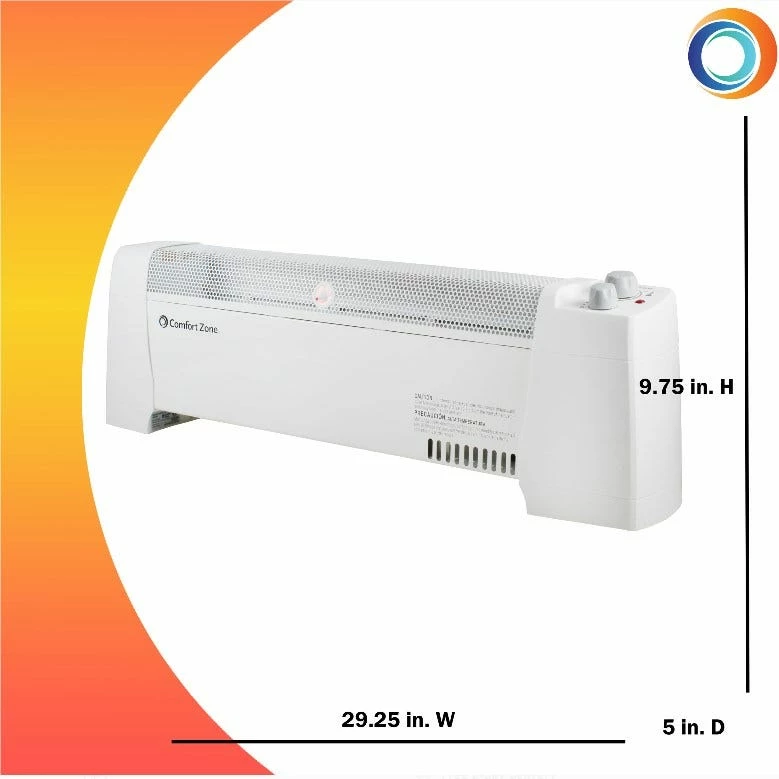The Baseboard Heater by Comfort Zone is a convection heater with two heat settings and silent operation to ensure that no one is disturbed. The sleek, low-profile white heater features dent-resistant end panels for durability, so the unit will look stylish for years to come.