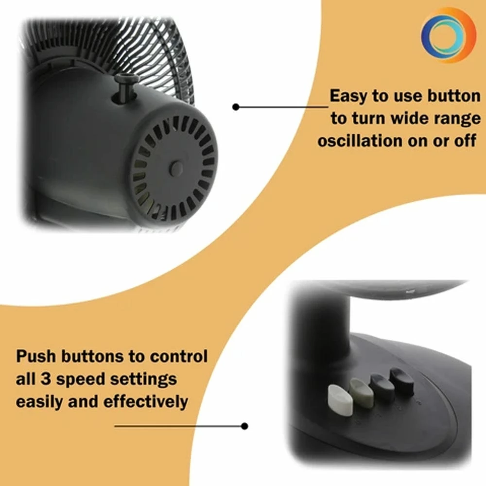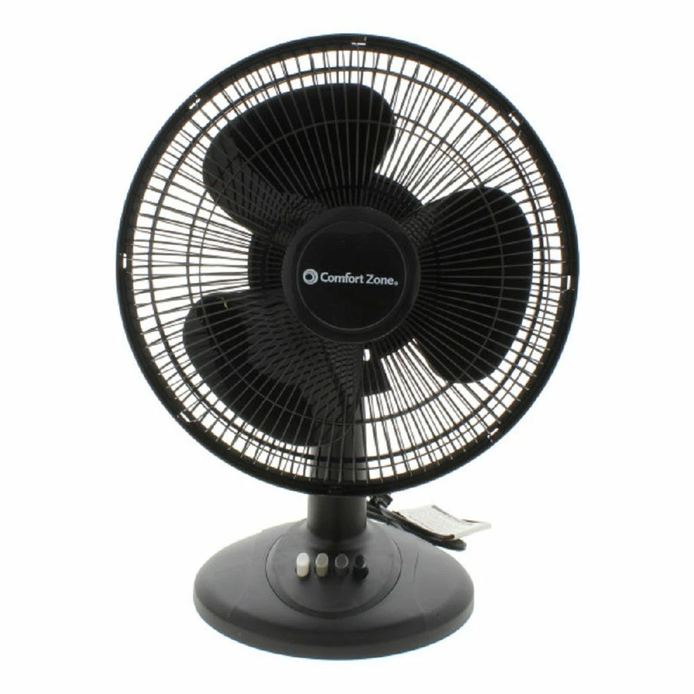 Get instant cooling and improve comfort in any room of your home or office with this Comfort Zone 12″ oscillating table fan. The portable table fan offers a choice of three different speeds, allowing you to customize air volume from high, medium or low to suit your needs. The oscillating function allows this 3-speed table fan to distribute air widely throughout your room for improved air circulation. Airflow can be directed by adjusting the angle of the fan head, providing a targeted air stream for efficient cooling. The oscillating table fan offers quiet operation without sacrificing performance. For added safety, the blades are covered by a metal grill to keep fingers and hands out of the way. The tabletop oscillating fan is lightweight and has a portable design so that you can easily move it to any room where you need it.