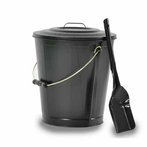 - Durable black matte finish. Decorative solid brass bail. Turned wooden handle for carrying comfort. Double bottom for safety. 17 3 4″ shovel.