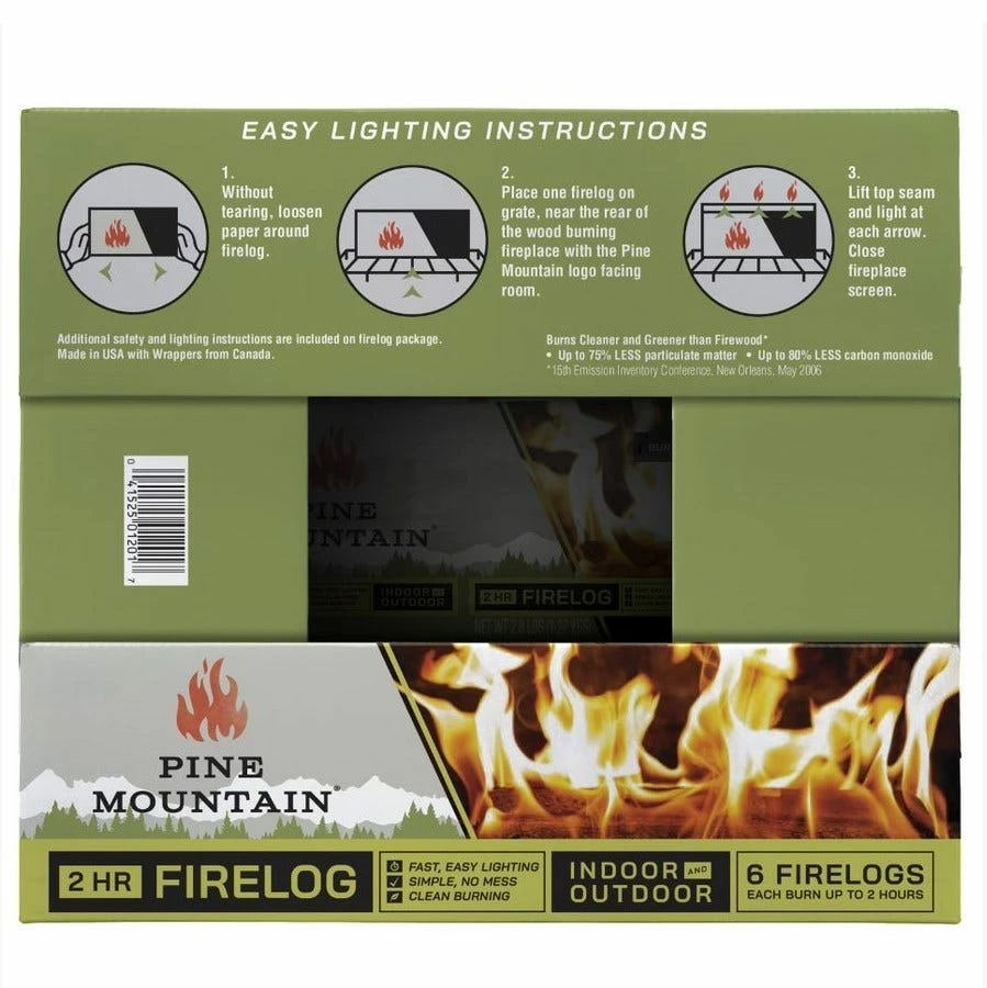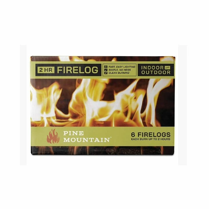 6 Pack indoor/outdoor pine mountain firelogs. Fast and easy lighting. Burns up to 7% more efficiently than competitor firelogs. Burns cleaner than ordinary cordwood, producing up to 75% less particulate matter and up to 80% less carbon monoxide.